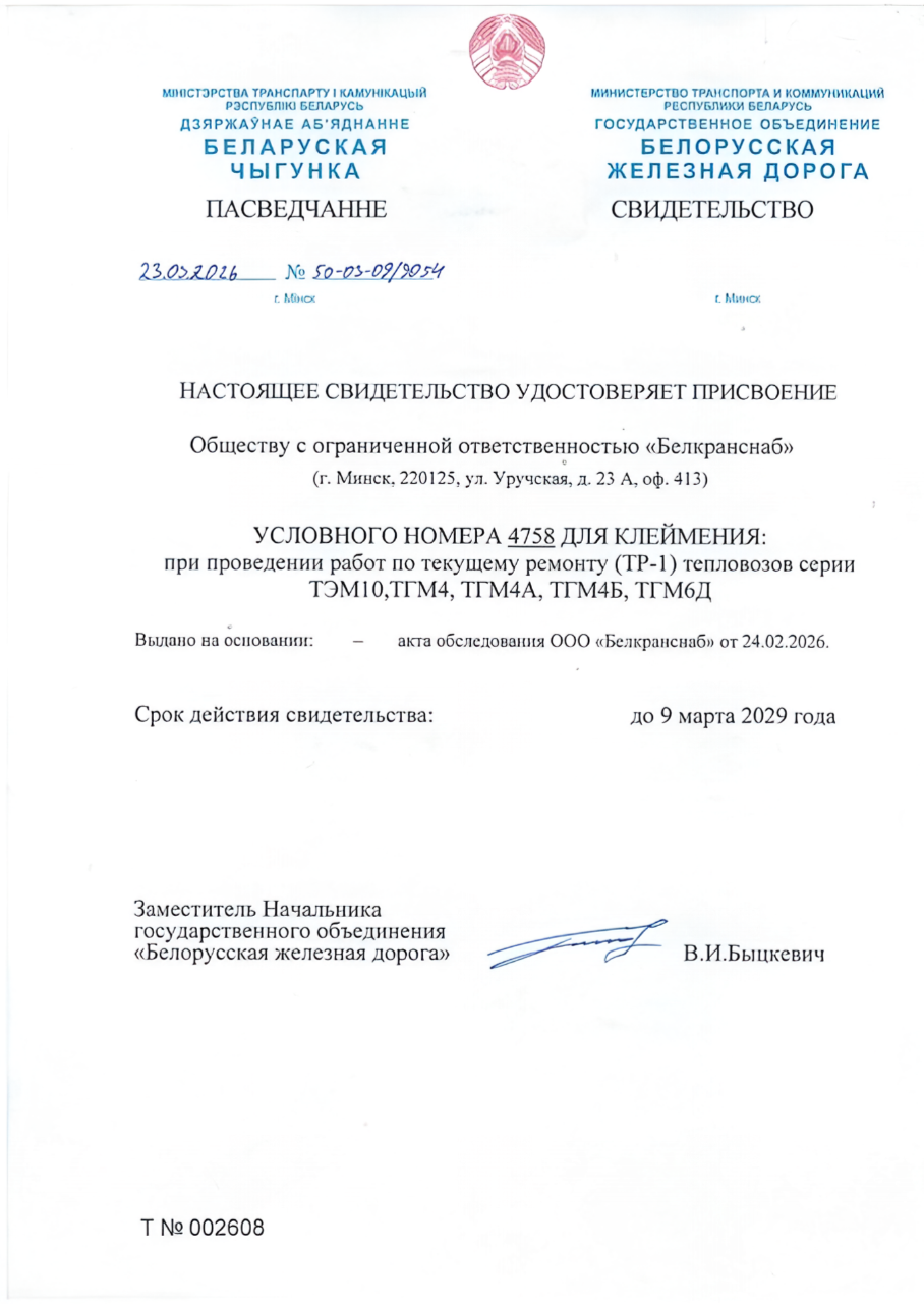 «ООО «Белкранснаб» присвоен условный номер клеймения (УНК) 4758 при проведении текущего ремонта тепловозов серии ТЭМ10, ТГМ4, ТГМ4А, ТГМ4Б, ТГМ6Д, дающий право предъявления тепловоза комиссии ГО «Белорусская железная дорога», с целью получения права выхода на железнодорожные пути общего пользования после выполнения данных работ нашим предприятием.