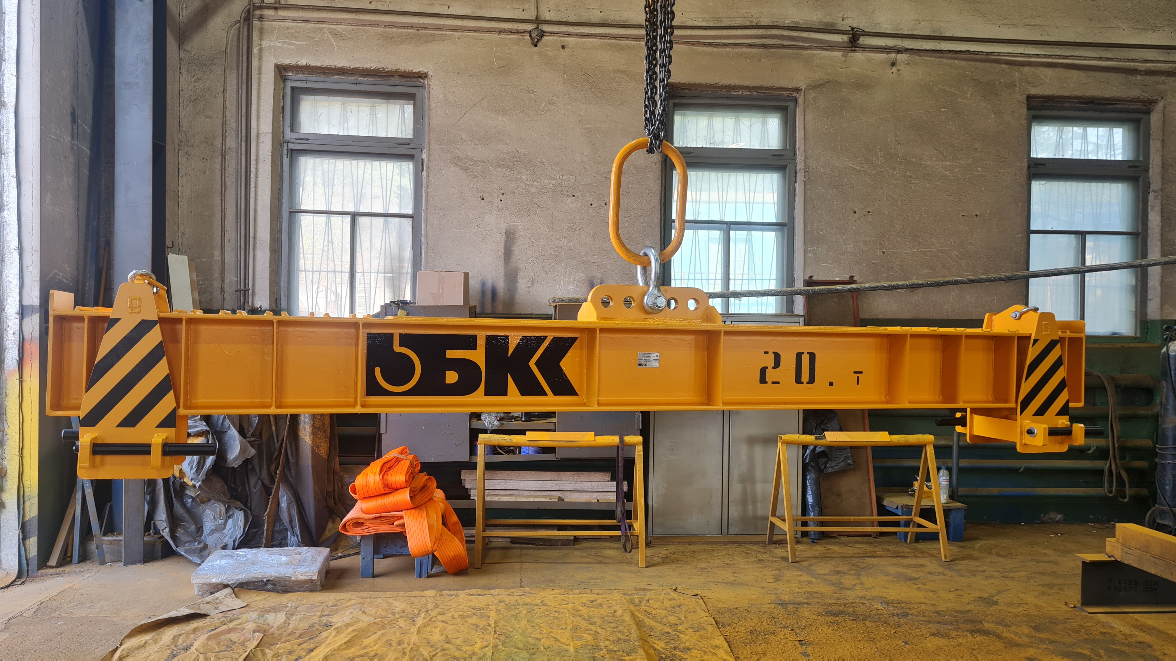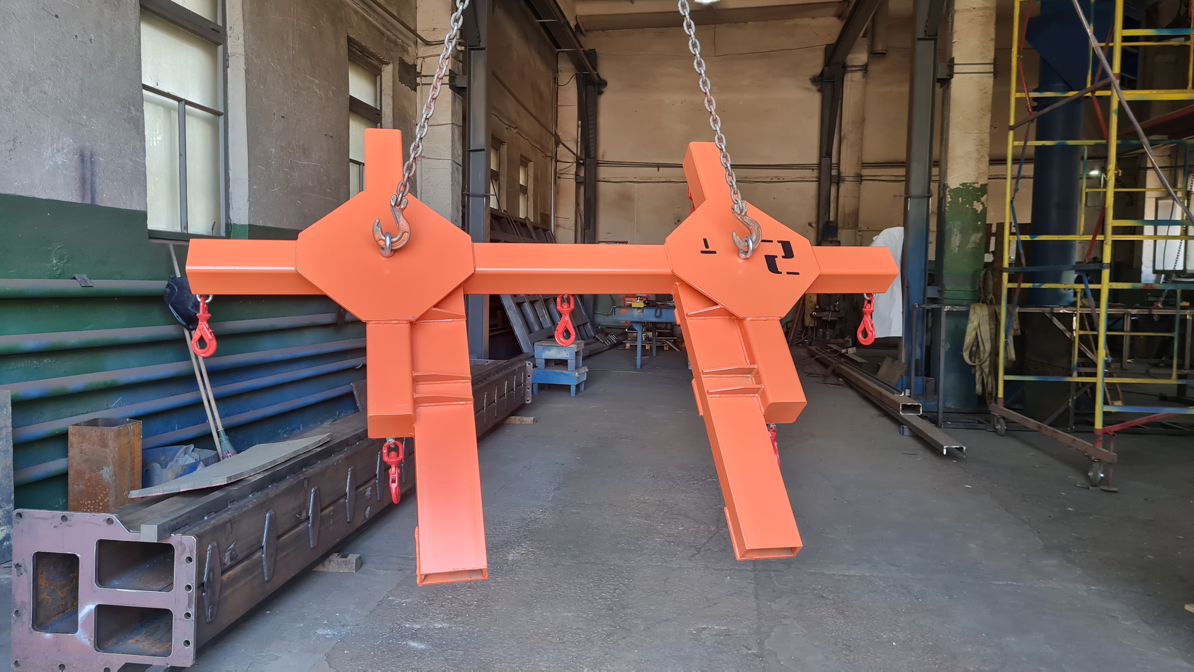 Н-образная траверса с подъёмом за центр — это несущая конструкция в форме буквы «Н», состоящая из двух вертикальных стоек и соединяющей их горизонтальной балки. Груз крепится к нижним точкам стоек, а подъём осуществляется через центральную проушину на верхней балке.