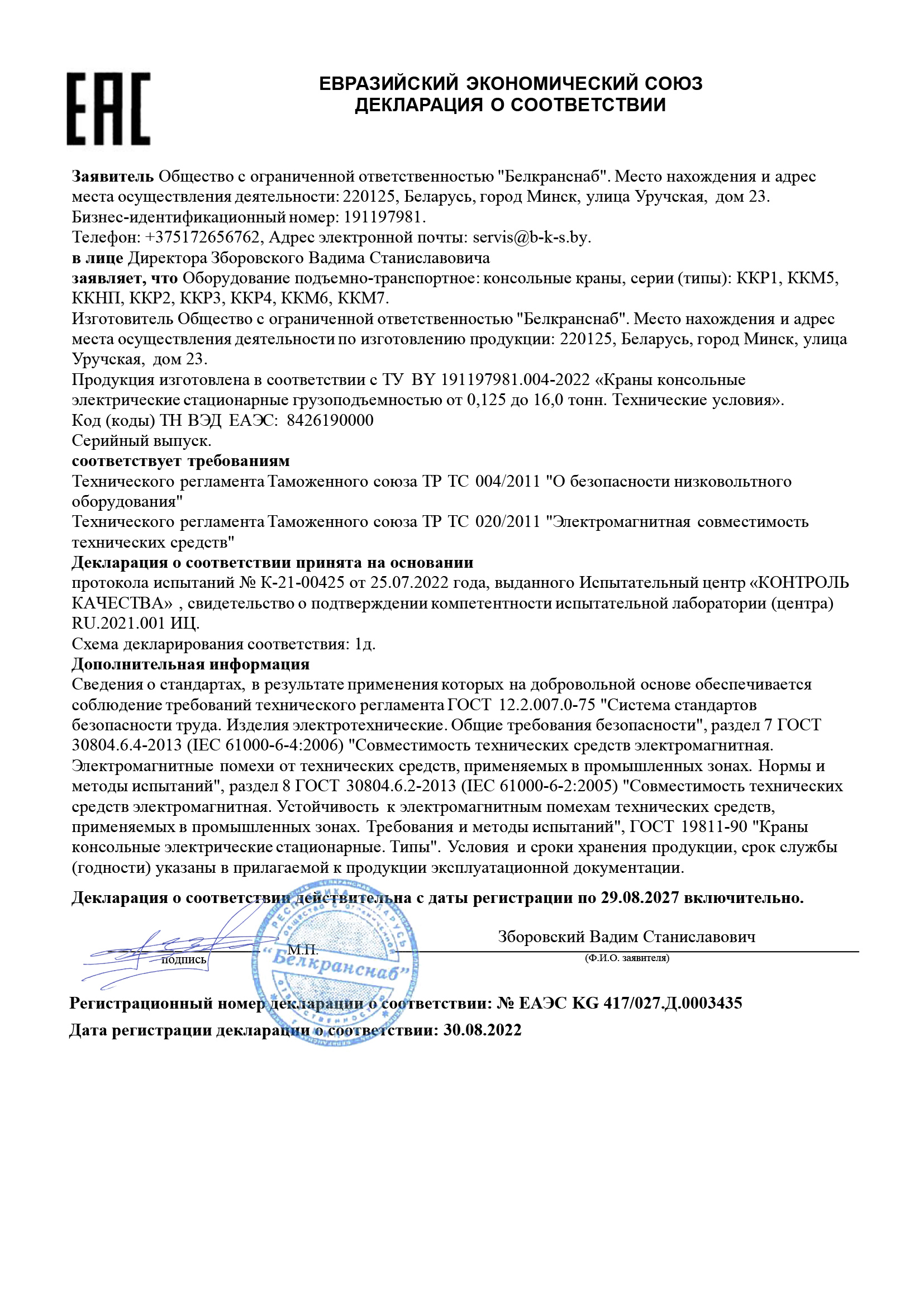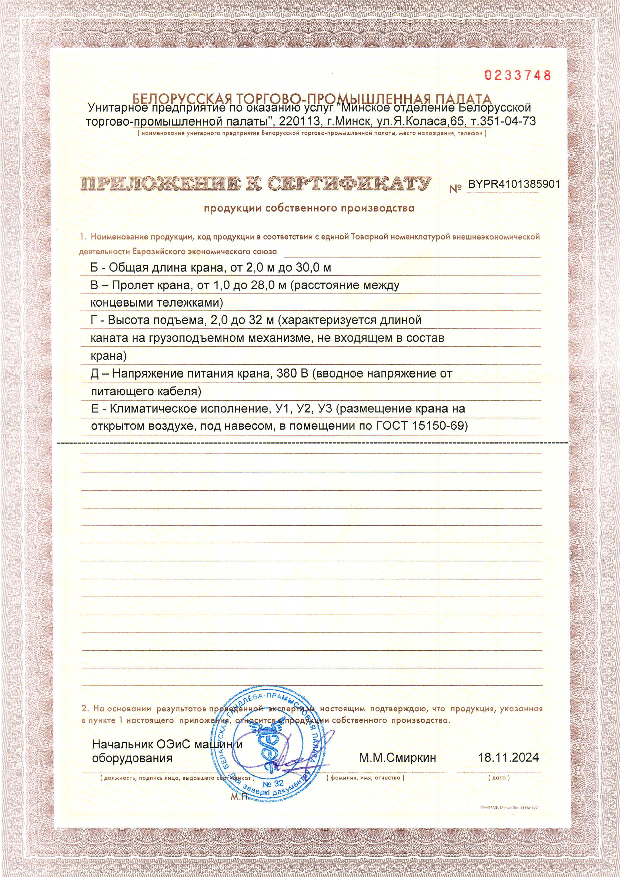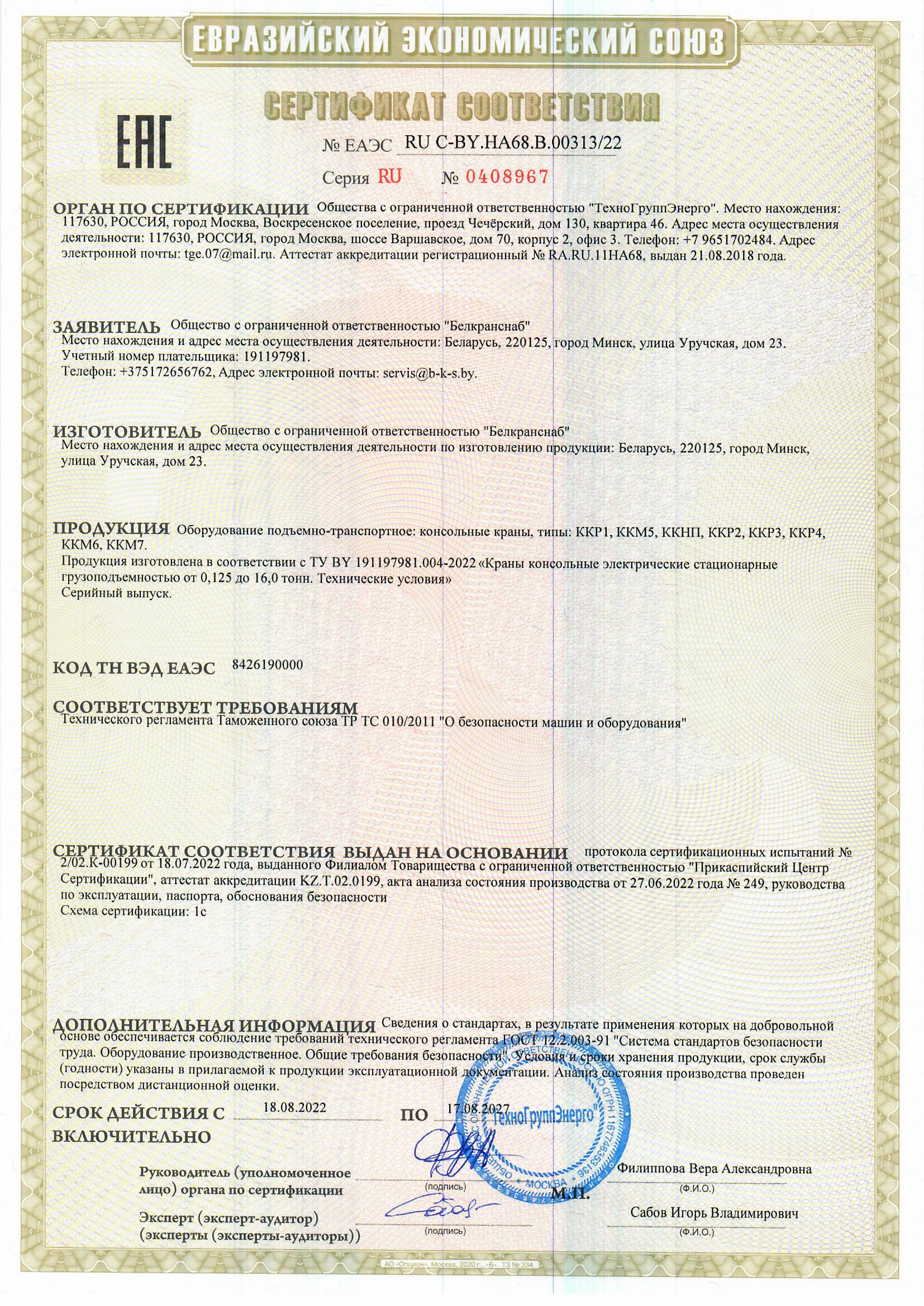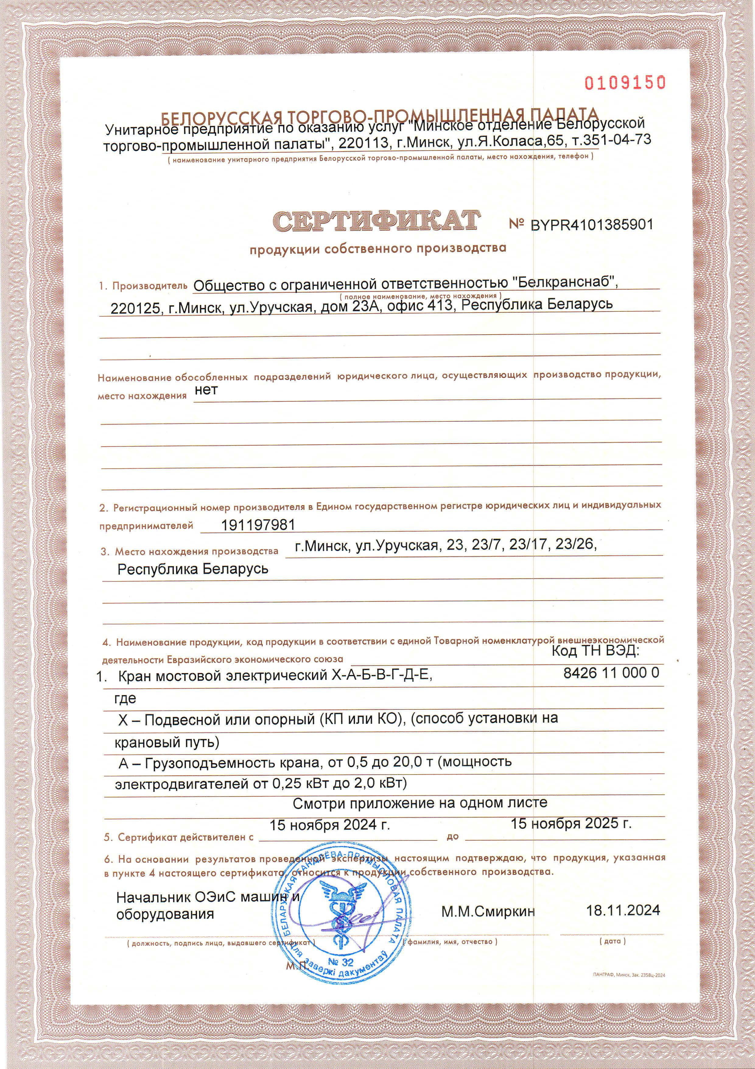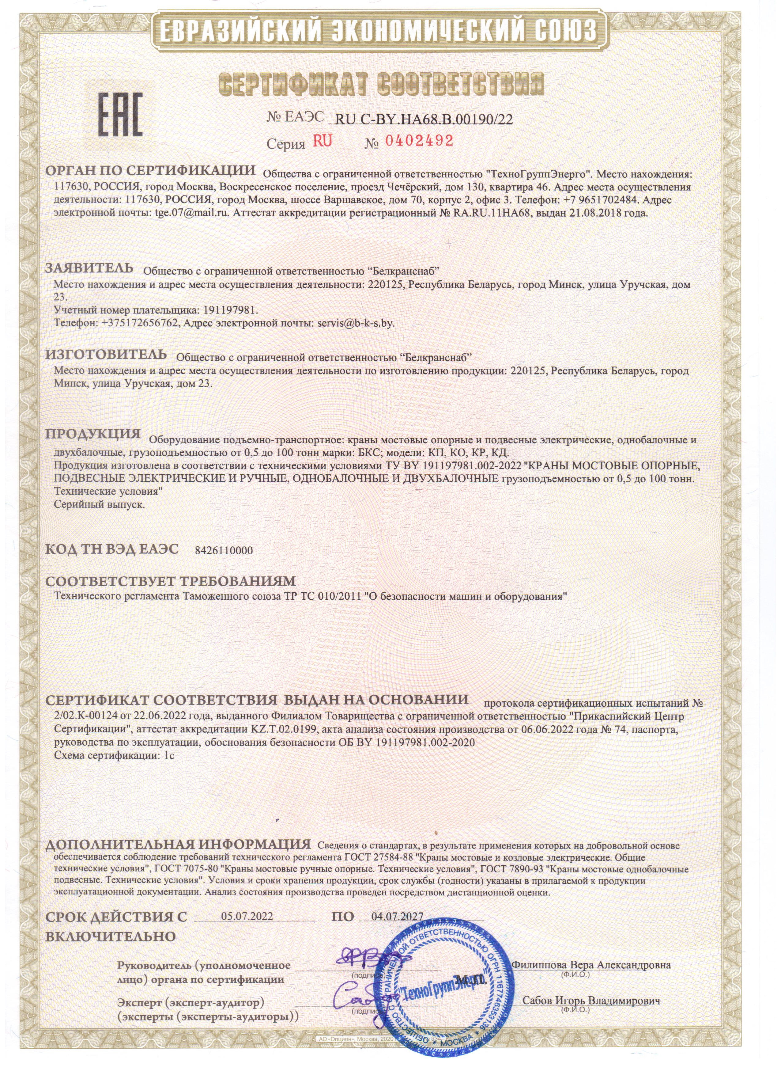 Сертификат соответствия ТР ТС на краны мостовые производства ООО "Белкранснаб"