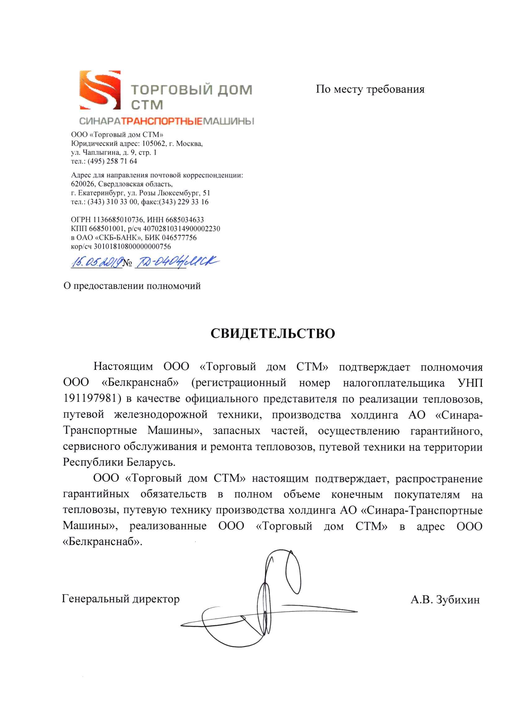 Свидетельство официального дилера и сервисного партнера АО "Синтара - Транспортные машины" в Республике Беларусь