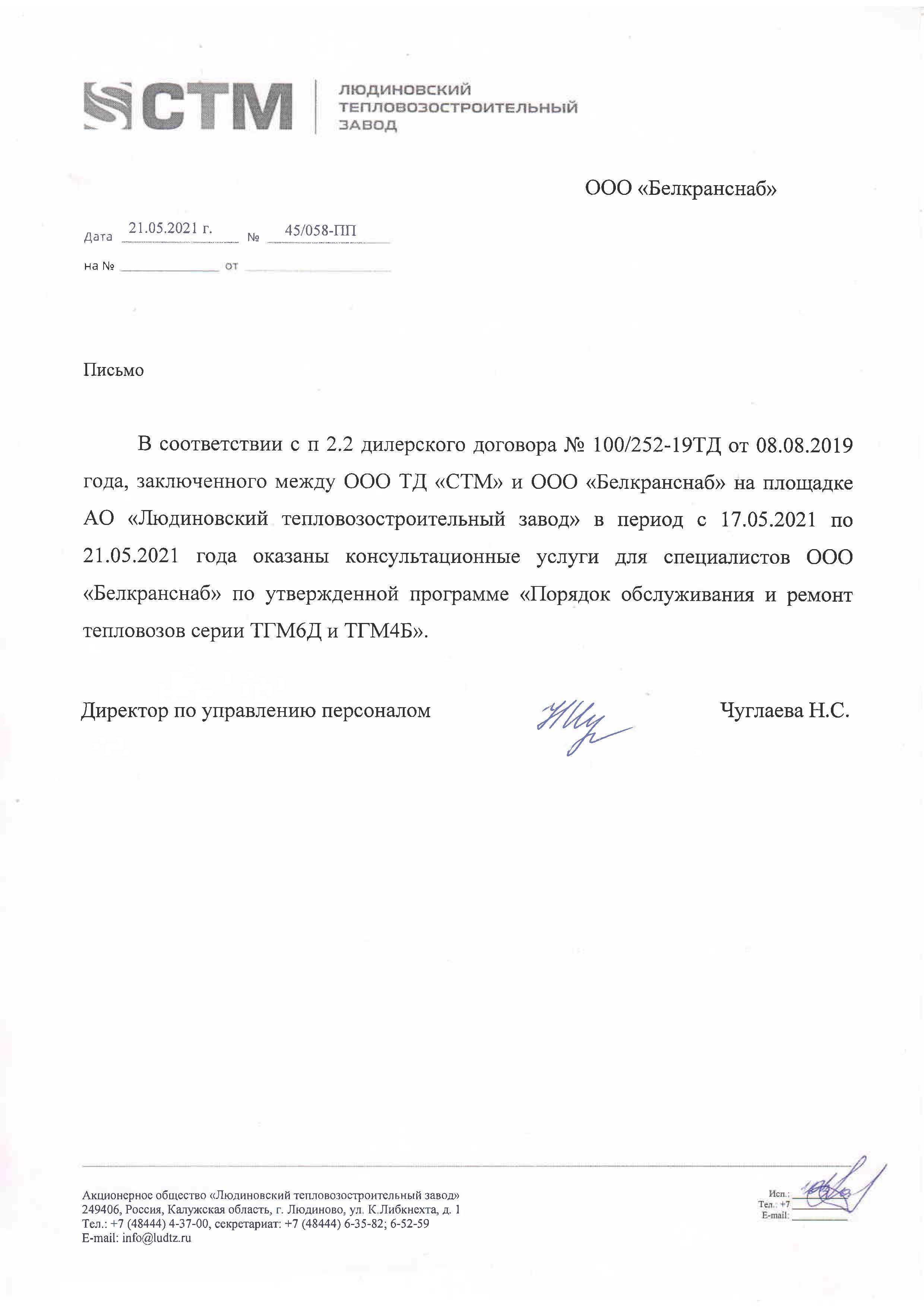 Письмо АО "ЛТЗ" о прохождении обучения персонала по ремонту и обслуживанию тепловозов