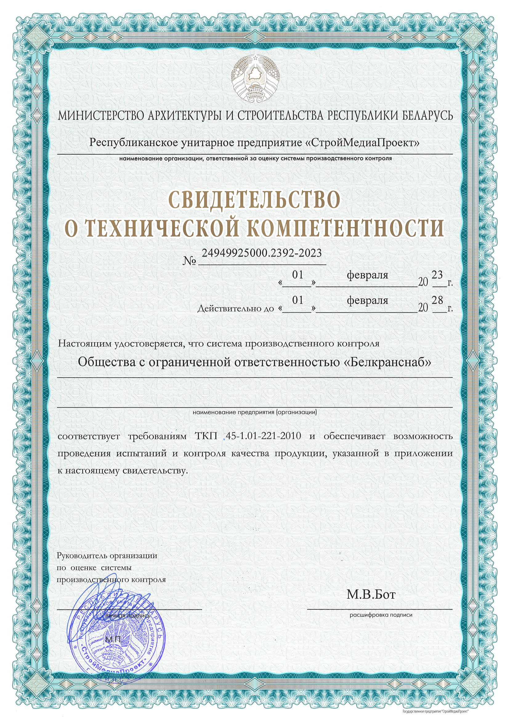Свидетельство о технической компетентности, выданный Министерством архитектуры и строительства Республики Беларусь