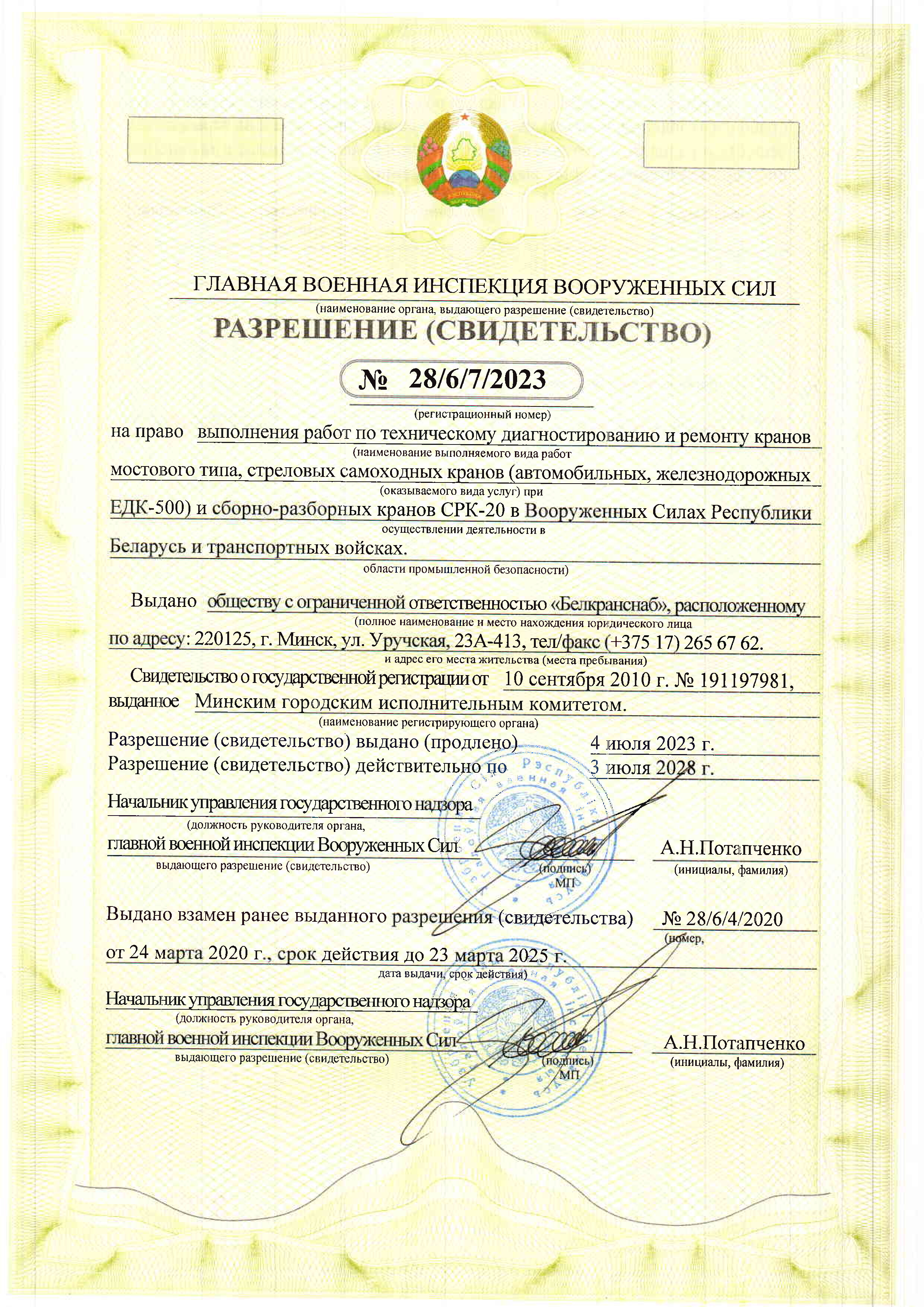 Специальное разрешение на диагностирование / ремонт различных кранов в Вооруженных силах и транспортных войсках РБ